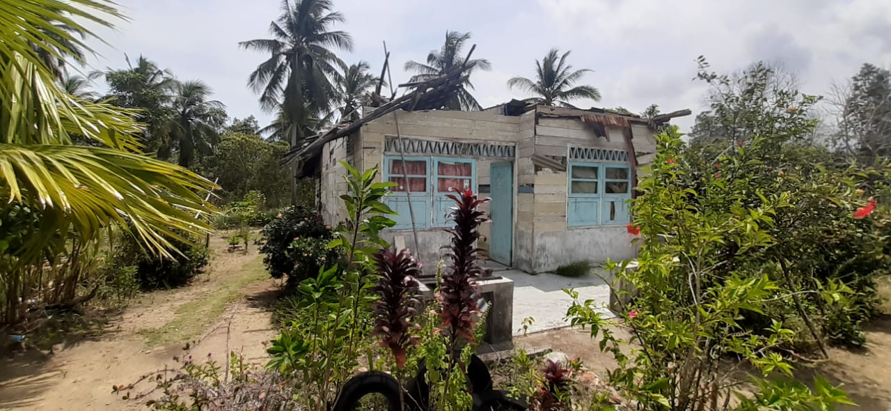 “Waktu malem itu, saya lagi tidur tau-tau ada bunyi gemuruh, saya kira itu guntur, tapi saya tetap baring. Saya kaget paginya rupanya suara gemuruh tadi malam atap rumah bagian depan roboh. Untungnya saya tidak apa-apa,” ujarnya.