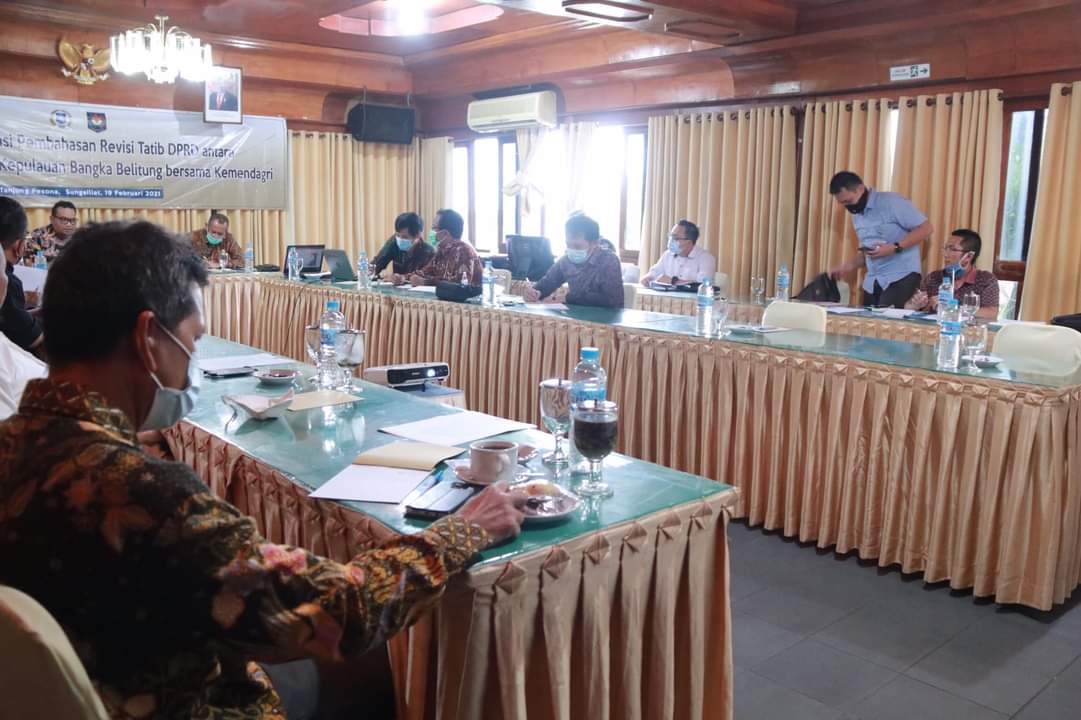 SUNGAILIAT, LASPELA – Tim Rancangan Tata Tertib Dewan Perwakilan Rakyat daerah Provinsi Kepulauan Bangka belitung, menggelar Rapat Koordinasi Pembahasan Revisi tata tertib (Tatib) DPRD antara Panitia khusus (Pansus) DPRD Babel bersama Kemendagri, Jumat (19/02/2021).