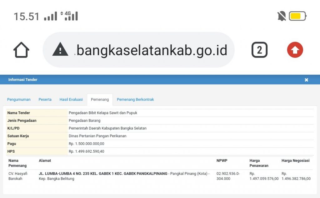 TOBOALI, LASPELA – Pejabat pembuat komitmen (PPK), Sukirman mengatakan untuk kontraktor perusahaan sebagai pemenang pengadaan bibit sawit dan pupuk senilai Rp 1,5 miliar dari APBD tahun anggaran 2021 untuk 12 desa di kabupaten Bangka Selatan yakni CV Hasyafi Barokah.