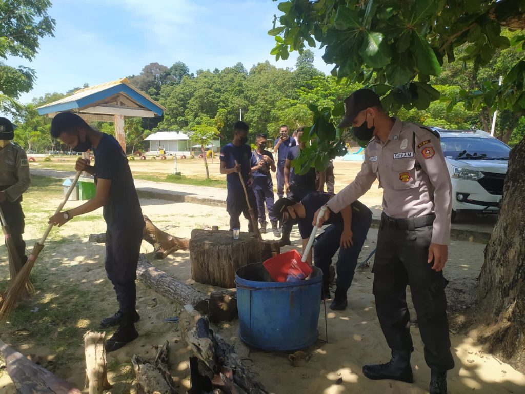 Selain memberikan paket sembako, Satuan Pengamanan PT Timah Tbk juga melaksanakan kegiatan bersih pantai di sepanjang pesisir Pantai Batu Rakit, Kecamatan Muntok.