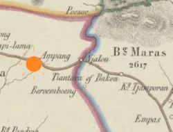 (Tanda titik oranye adalah Kampung Ampang yang sekarang adalah Kampung Kelapa berdasarkan Kaart van het Eiland Banka, H.M Lange 1845-1846)