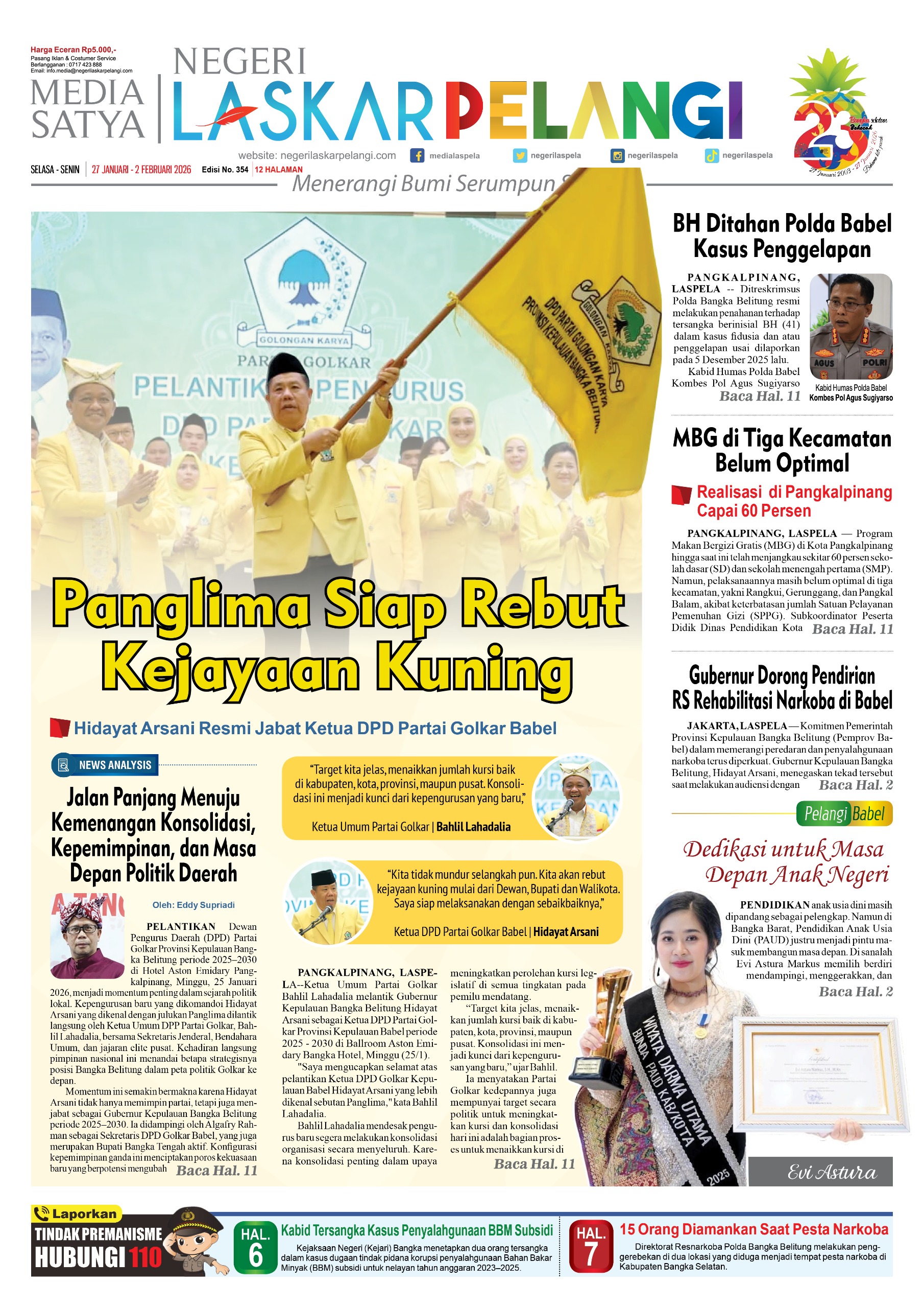 Dalam usia 62 tahun Hidayat Arsani berhasil menduduki posisi orang nomor satu di Provinsi Babel. Suami dari Ni Komang Widari ini resmi dilantik menjadi Gubernur Provinsi Kepulauan Bangka Belitung periode 2025-2030 oleh Presiden Prabowo Subianto di Jakarta pada hari Kamis 17 April lalu. Sebelumnya pria yang akrab disapa Dayat ini juga pernah menjabat sebagai Wakil Gubernur Babel periode 2014-2017.(a1)