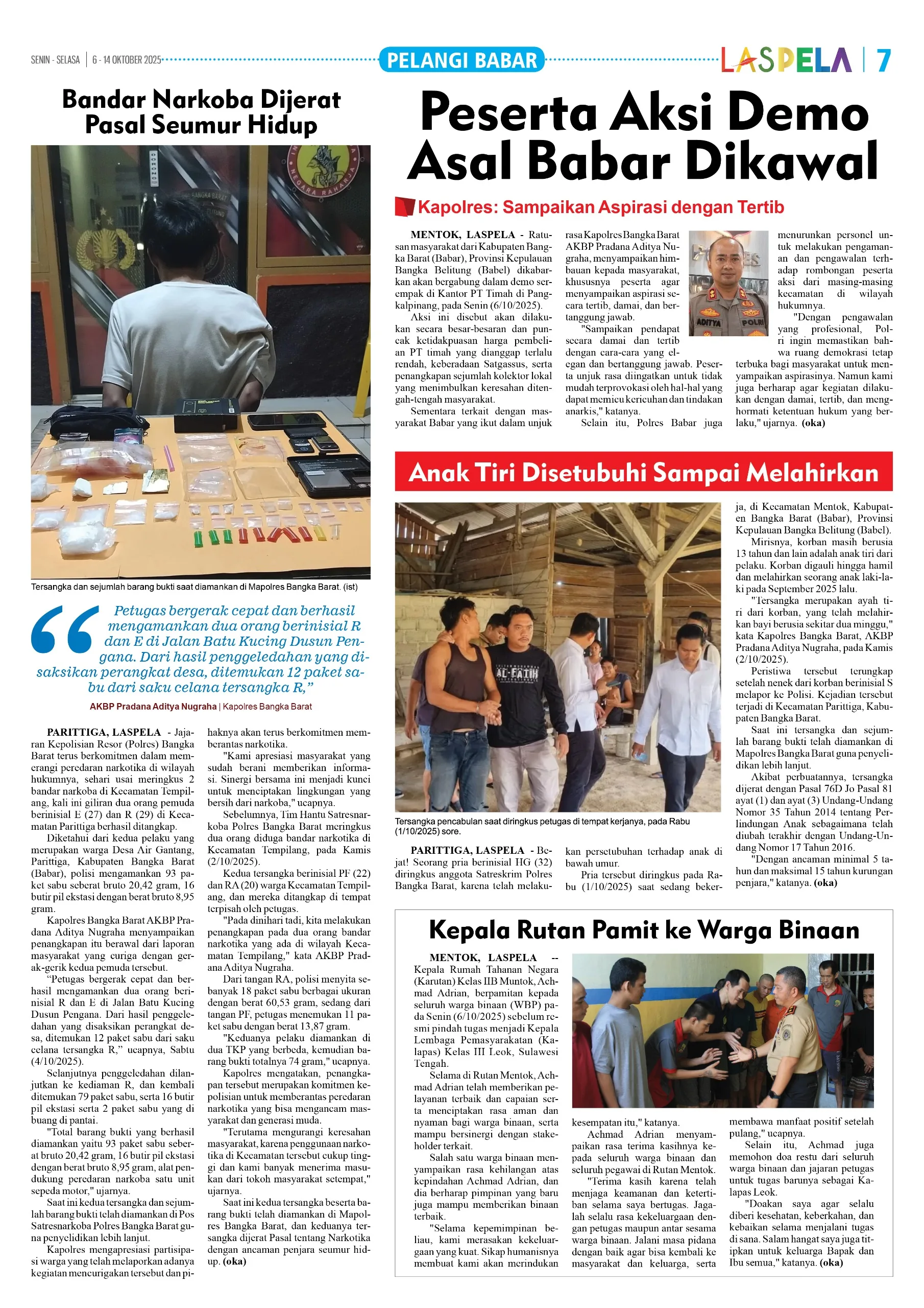 MENTOK, LASPELA–Selama sepekan, kriminalitas di wilayah Kabupaten Bangka Barat terbilang cukup tinggi. Berawal dari ratusan masyarakat dari Kabupaten Bangka Barat (Babar), Provinsi Kepulauan Bangka Belitung (Babel) bergabung dalam demo serempak di Kantor PT Timah di Pangkalpinang, pada Senin (6/10/2025) yang berakhir ricuh, pagar kawat dijebol, korban berjatuhan terkena gas air mata serta kaca kantor dan perlengkapan dirusak.