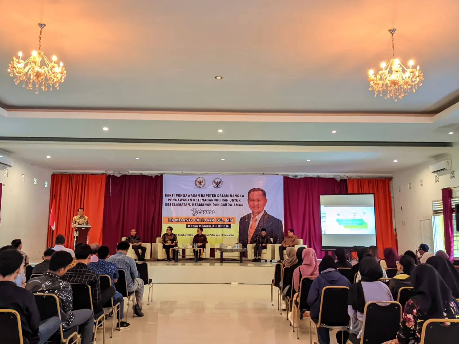Ketua Komisi XII DPR RI, Bambang Patijaya saat kegiatan Bakti Pengawasan BAPETEN dalam Rangka Pengawasan Ketenaganukliran untuk Keselamatan, Keamanan dan Garda Aman, di Stisipol Pahlawan 12, Sungailiat, Selasa (7/10/2025).