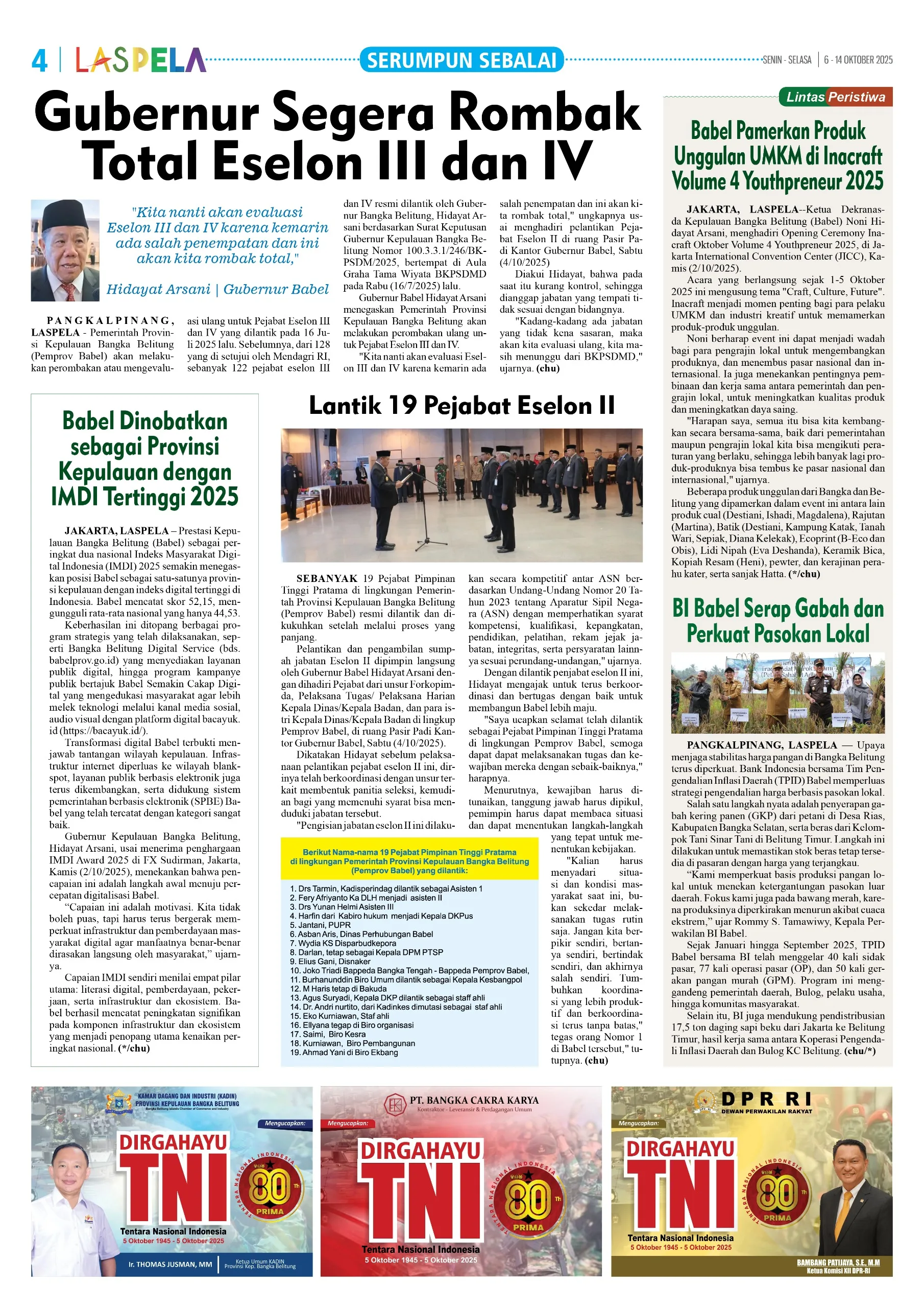 “Kita nanti akan evaluasi Eselon III dan IV karena kemarin ada salah penempatan dan ini akan kita rombak total,” ungkapnya usai menghadiri pelantikan Pejabat Eselon II di ruang Pasir Padi Kantor Gubernur Babel, Sabtu (4/10/2025)