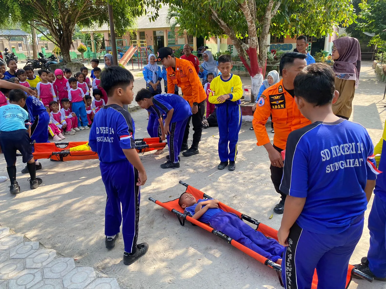 Dalam kegiatan tersebut, para siswa juga mengikuti geladi teknik pengangkatan dan pemindahan korban ke tandu, sebagai bagian dari persiapan simulasi bencana alam gempa bumi.