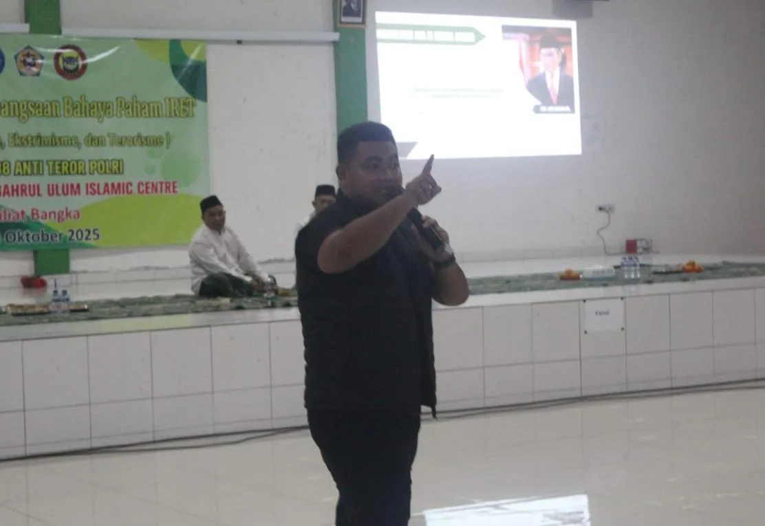 SUNGAILIAT, LASPELA — Densus 88 Anti Teror Polri melakukan sosialisasi wawasan kebangsaan bertema “Pencegahan Intoleransi, Radikalisme, Terorisme, dan Ekstremisme” di Gedung Serbaguna Islamic Centre Sungailiat, Sabtu (11/10/2025).