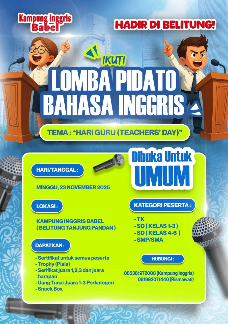 “Kami ingin menghadirkan suasana belajar yang aktif, kreatif, dan penuh semangat. Lomba ini menjadi awal langkah kami untuk menginspirasi anak-anak Belitung agar berani tampil dan berkomunikasi dalam Bahasa Inggris,” ujar Rismawati, perwakilan panitia.