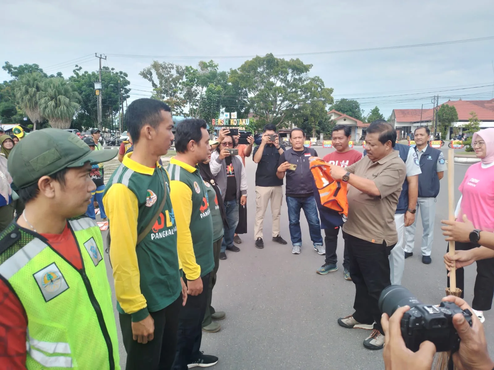 PANGKALPINANG, LASPELA – Wali Kota Pangkalpinang, Prof. Saparudin (Udin), serahka bantuan berupa rompi dan sapu lidi yang diberikan oleh PT Jasa Raharja Cabang Kepulauan Bangka Belitung (Babel) kepada 100 petugas kebersihan di Kota Pangkalpinang.