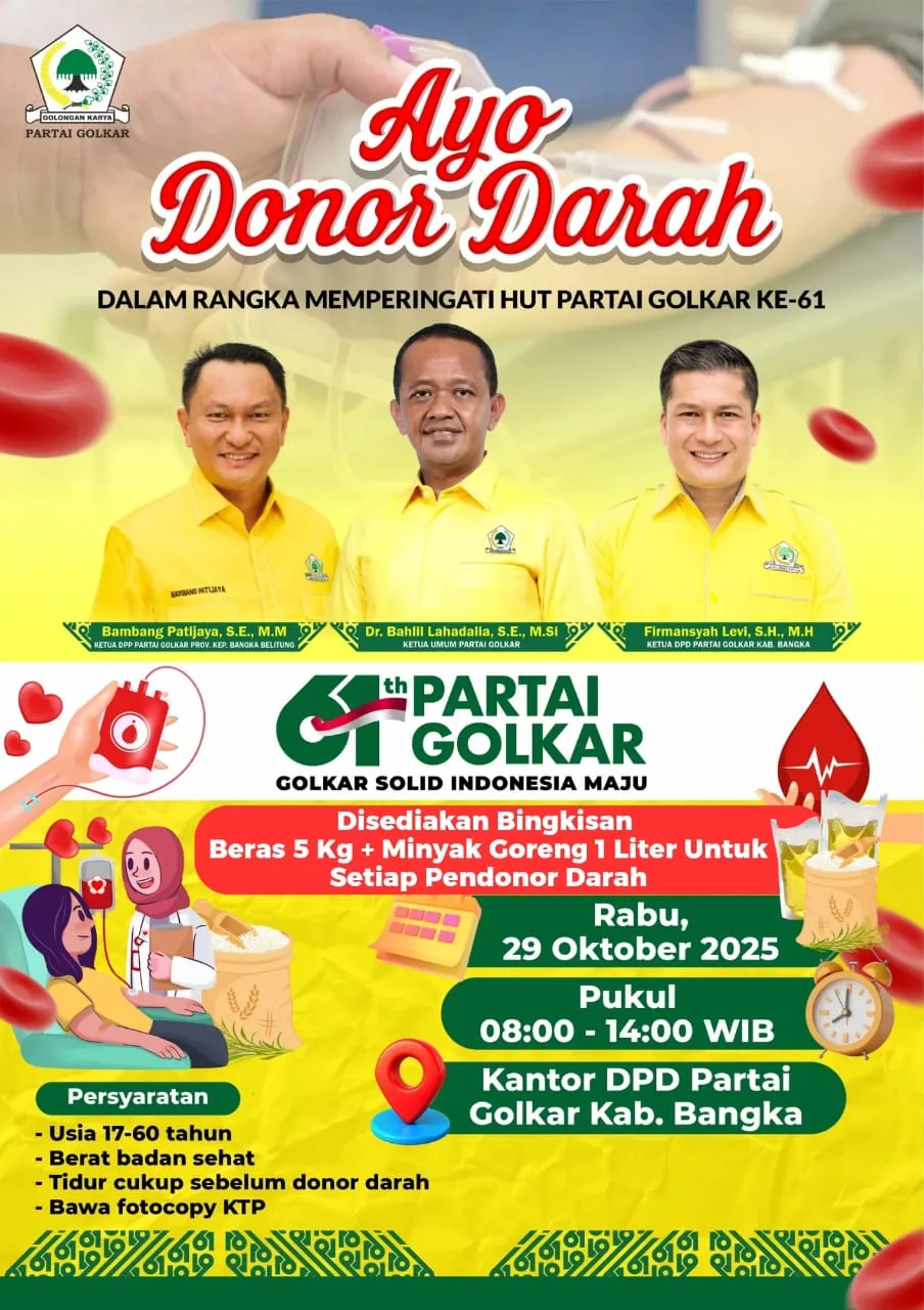 “DPD Partai Golkar Bangka mengajak seluruh masyarakat untuk ikut berpartisipasi dalam kegiatan donor darah sebagai bentuk kepedulian terhadap sesama,” ajaknya.