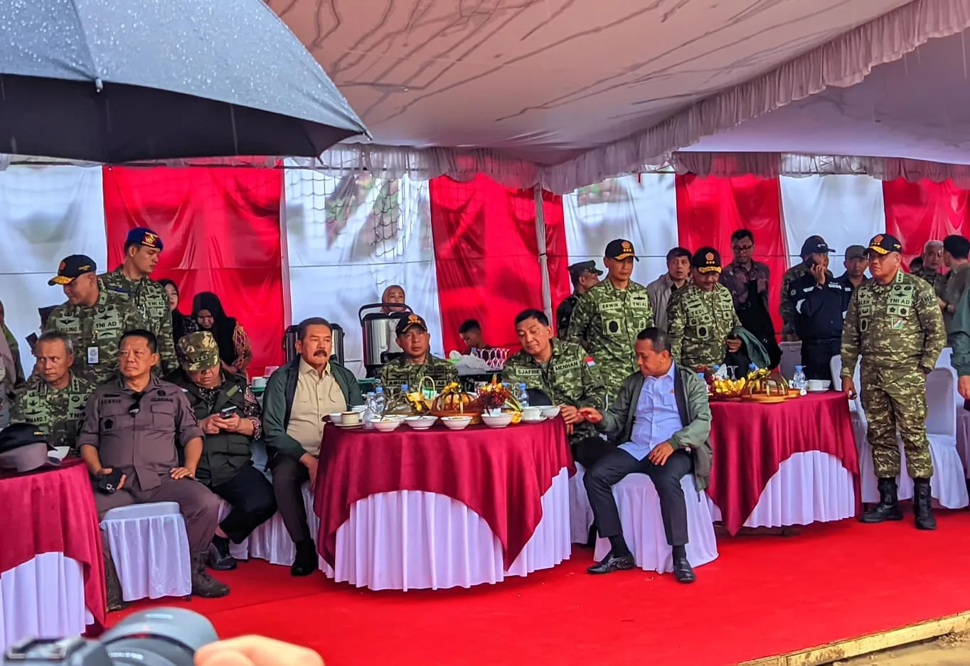 Menteri Pertahanan Republik Indonesia, Sjafrie Sjamsoeddin bersama panglima TNI, Jendral Agus Subiyanto, Jaksa Agung ST Burhanudin, dan Mentri ESDM, Bahlil Lahadalia saat menghadiri Latihan Kogab, di Desa Mabat, Rabu (19/11/2025).