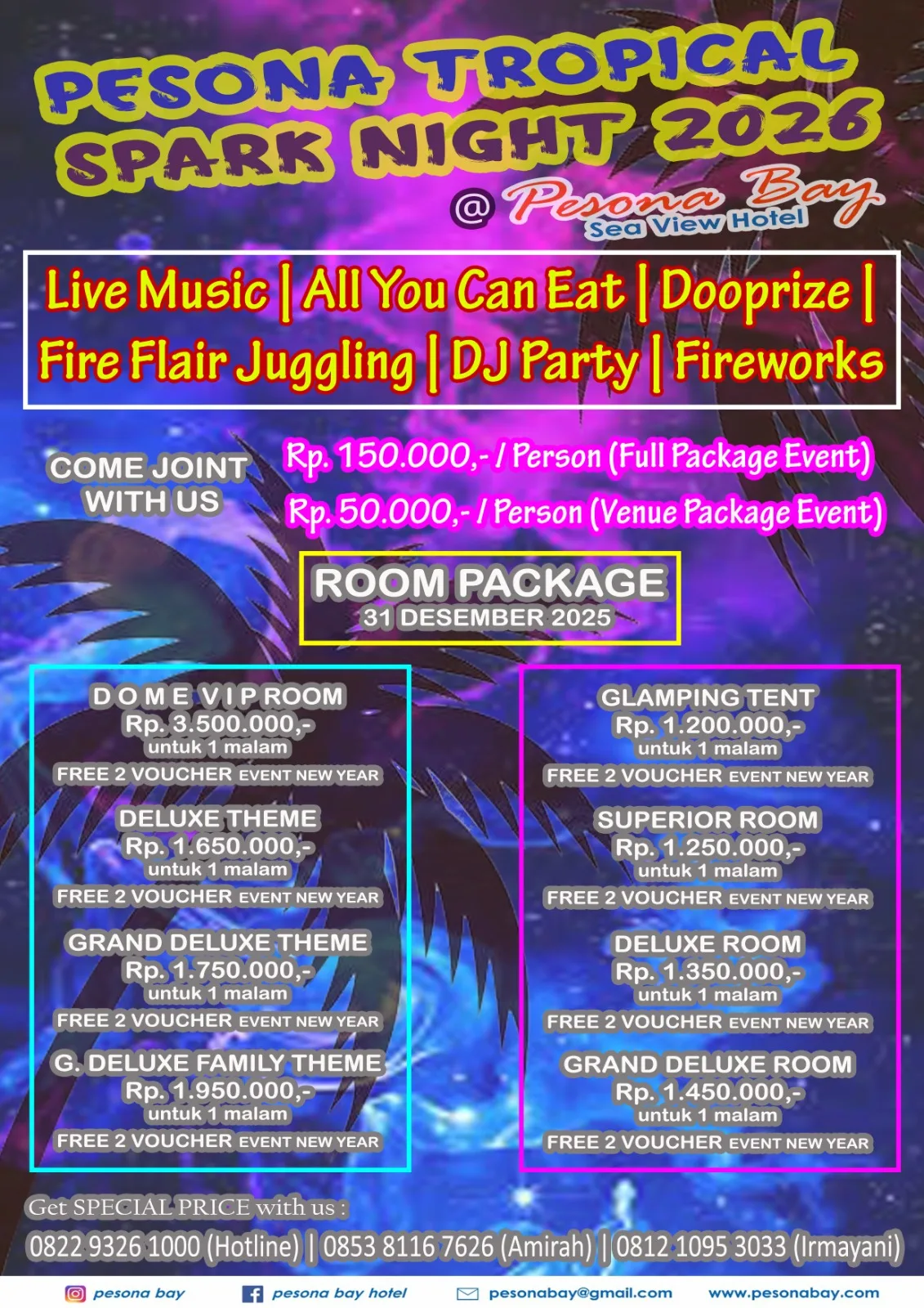 Pesona Bay Sea View Hotel menyiapkan aneka paket seperti Dome VIP Room, Rp 3.500.000 untuk satu malam, free dua voucher event new year. deluxe theme Rp 1.650.000 untuk satu malam, free dua voucher event new year, grand deluxe theme, Rp 1.750.000 untuk satu malam, free dua voucher event new year, G. Deluxe Famly Theme, Rp 1.950.000 untuk satu malam, free dua voucher event new year. Selain itu, paket glamping tent Rp 1.200.000 untuk satu malam, free dua voucher event new year, Superior Room, Rp 1.250.000, Deluxe room Rp 1.350.000, Grnad Deluxe Room Rp 1.450.000.