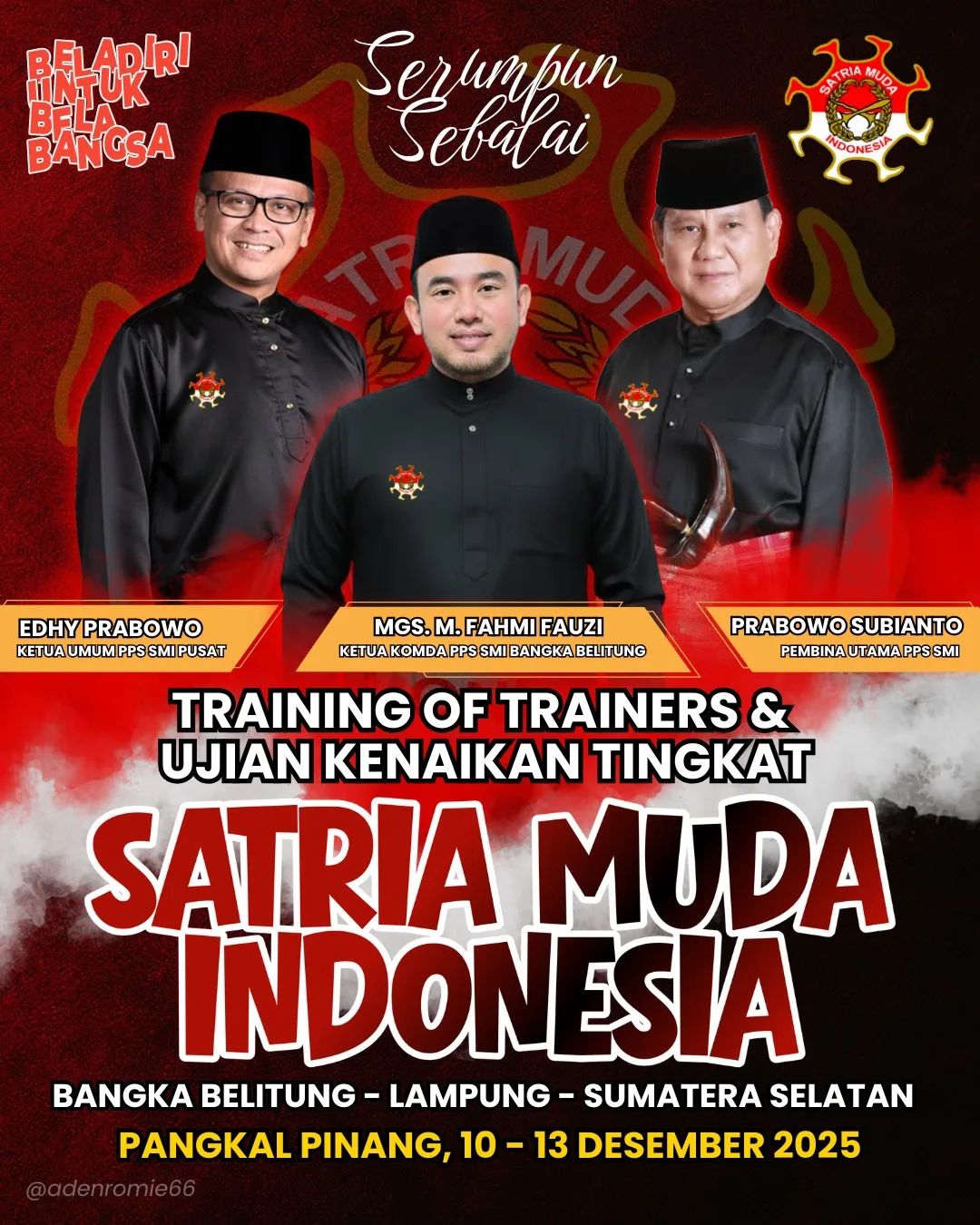 Ketua PPS SMI Komda Babel MGS.M.Fahmi Fauzi, SE, MM kepada LASPELA, Senin (8/12/2025) mengatakan kepastian terpilihnya Komda Babel sebagai tuan rumah penyelenggara Program SMI Pusat tersebut berdasarkan Surat Penunjukan dari Pengurus Pusat PPS Satria Muda Indonesia Nomor 08/SMI-PUSAT/X/2025 tanggal 29 Oktober 2025 yang ditandatangani langsung oleh Ketua Umum Dr.Edhy Prabowo, SE, MM,MBA.
