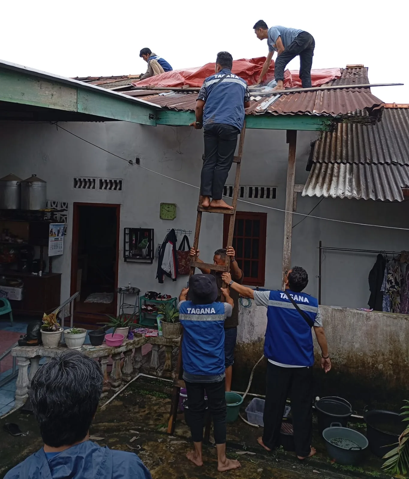 Tim BPBD dan TAGANA gercep melakukan tindakan darurat berupa pemasangan terpal di atap untuk mencegah kebocoran dan agar air tidak masuk membanjiri ruang kamar dan ruang tengah rumah.