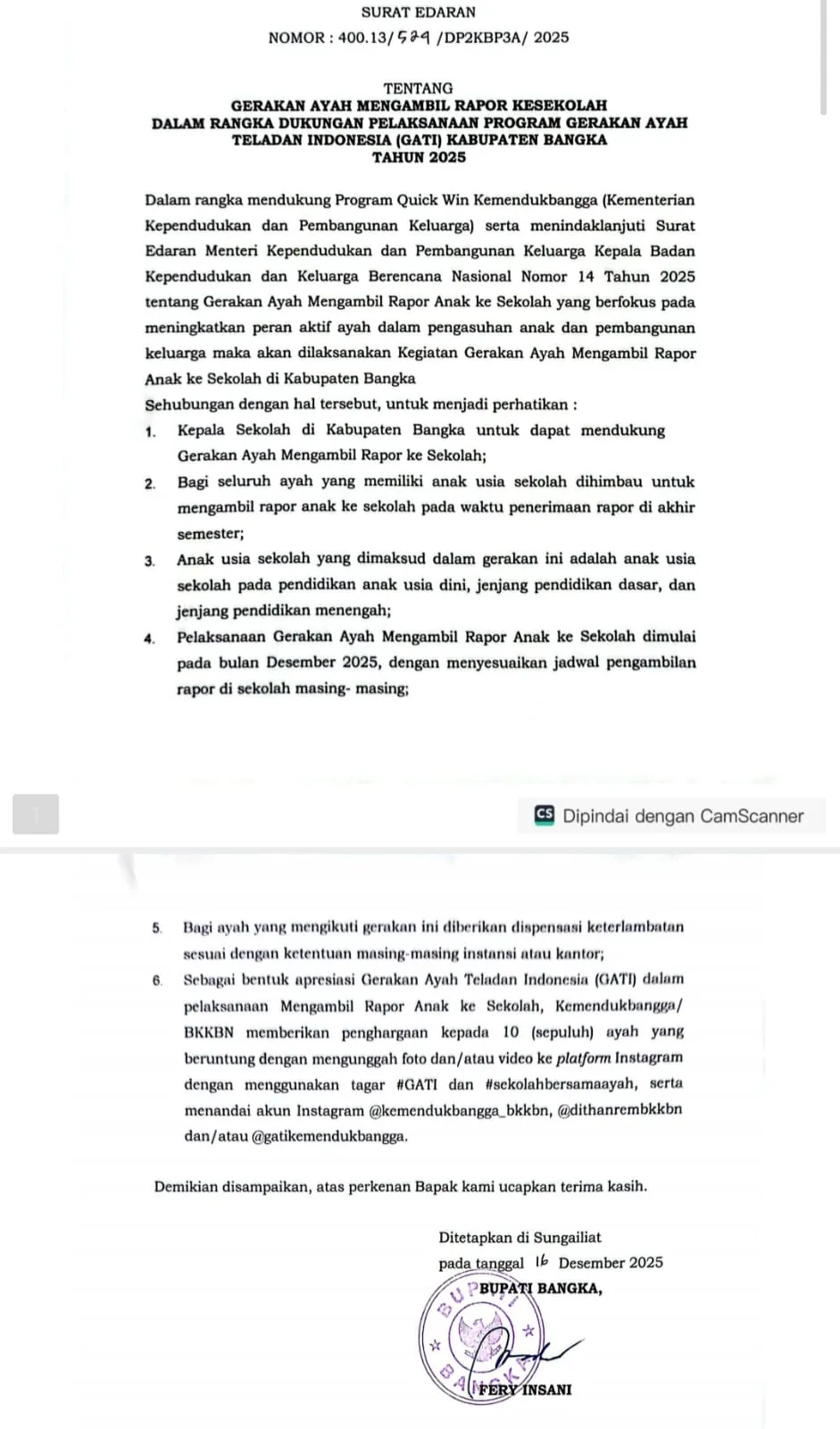 Kebijakan ini tertuang dalam Surat Edaran Bupati Bangka Nomor 400.13/579/DP2KBP3A/2025 yang mulai berlaku pada Desember 2025.