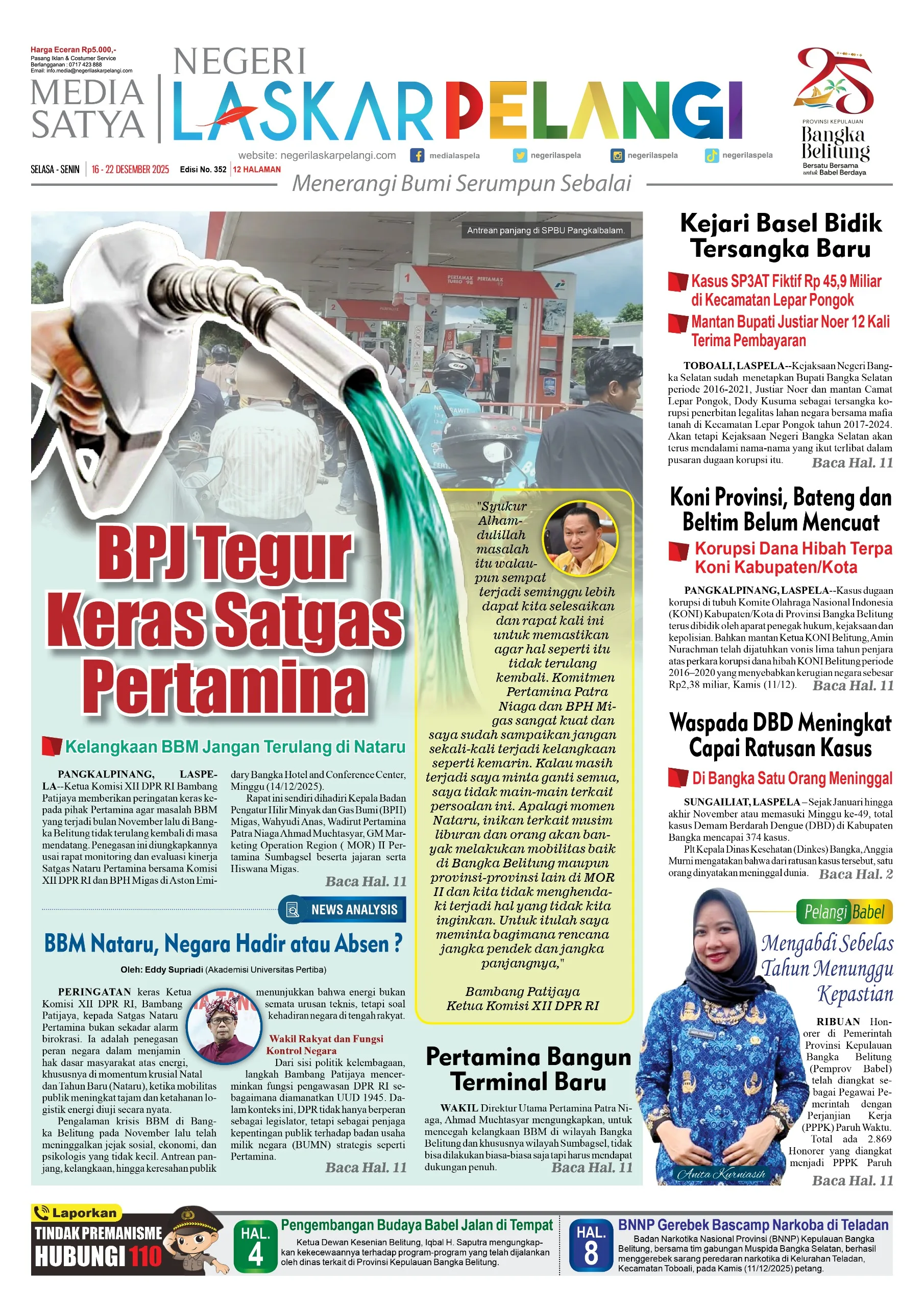 PANGKALPINANG, LASPELA–Ketua Komisi XII DPR RI Bambang Patijaya memberikan peringatan keras kepada pihak Pertamina agar masalah BBM yang terjadi bulan November lalu di Bangka Belitung tidak terulang kembali di masa mendatang. Penegasan ini diungkapkannya usai rapat monitoring dan evaluasi kinerja Satgas Nataru Pertamina bersama Komisi XII DPR RI dan BPH Migas di Aston Emidary Bangka Hotel and Conference Center, Minggu (14/12/2025).