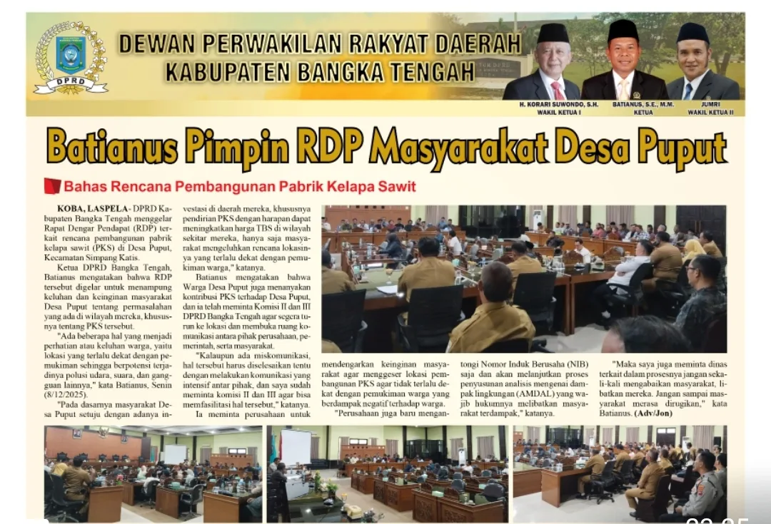 KOBA, LASPELA– DPRD Kabupaten Bangka Tengah menggelar Rapat Dengar Pendapat (RDP) terkait rencana pembangunan pabrik kelapa sawit (PKS) di Desa Puput, Kecamatan Simpang Katis. Ketua DPRD Bangka Tengah, Batianus mengatakan bahwa RDP tersebut digelar untuk menampung keluhan dan keinginan masyarakat Desa Puput tentang permasalahan yang ada di wilayah mereka, khususnya tentang PKS tersebut.