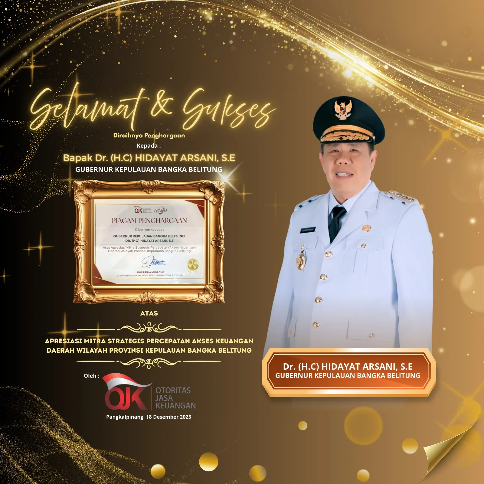 Sementara Deputi Kepala Perwakilan OJK Babel Soni Prima Nugroho, menyampaikan bahwa apresiasi yang diberikan merupakan bentuk penghargaan atas peran aktif Pemprov Babel dalam mendukung implementasi program TPAKD, mulai dari kebijakan, fasilitasi, hingga penguatan kolaborasi lintas sektor.