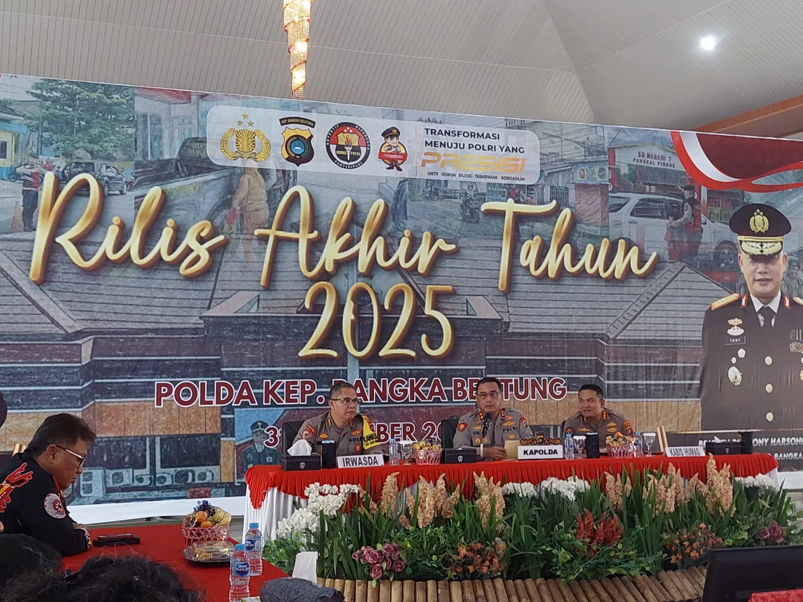 Kapolda Babel saat memberikan keterangan pers pada Rilis Akhir Tahun 2025 yang digelar di Gedung Tribrata Polda Babel, Rabu (31/12/2025)