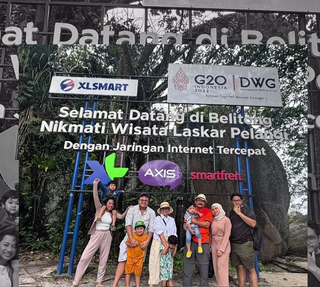 Retno tampak menikmati liburan bersama keluarganya, berfoto bersama dengan latar belakang pantai khas Belitung yang memanjakan mata.