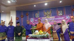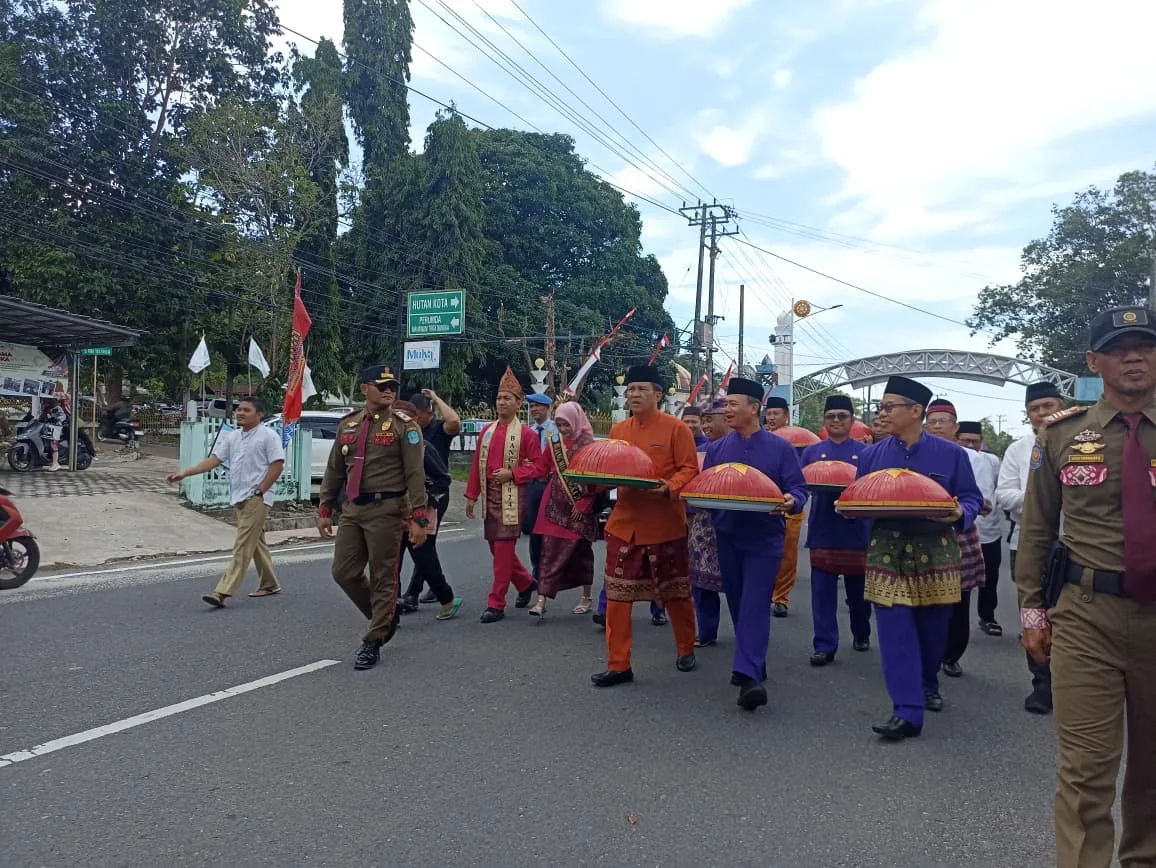 Bupati Bangka Fery Insani bersama Wakil Bupati Bangka Syahbudin, Ketua DPRD Bangka Jumadi, Penjabat Sekda Bangka Thony Marza dan para Kepala Organisasi Perangkat Daerah (OPD) beramai-ramai membawa dulang untuk nganggung.