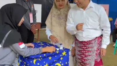 KELAPA, LASPELA— Calon Bupati Bangka Barat, Mansah mencoblos di TPS 02 Desa Mancung, Kecamatan Kelapa….