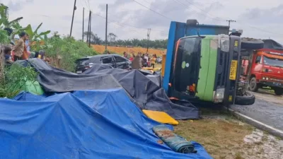 SIMPANG TERITIP, LASPELA — Truk berwarna biru dengan nomor polisi B 9841 UYX yang membawa…